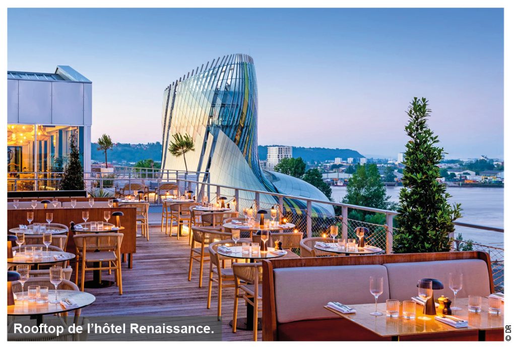 Ancré dans son quartier, l’hôtel Renaissance accueille clientèle d’affaires, de loisirs ou habitants du quartier dans un cadre raffiné. L’entrée de l’établissement de 9 étages se fait par deux silos réhabilités ; les visiteurs découvrent ensuite un lobby étendu donnant sur un jardin et sur les Halles Bacalan. Équipé d’une superbe piscine intérieure avec vue sur la ville, l’hôtel dispose en outre de l’un des plus hauts rooftops de Bordeaux offrant une vue panoramique sur le Port de Lune et sur lequel le bar-restaurant Gina propose cocktails et spécialités italiennes.